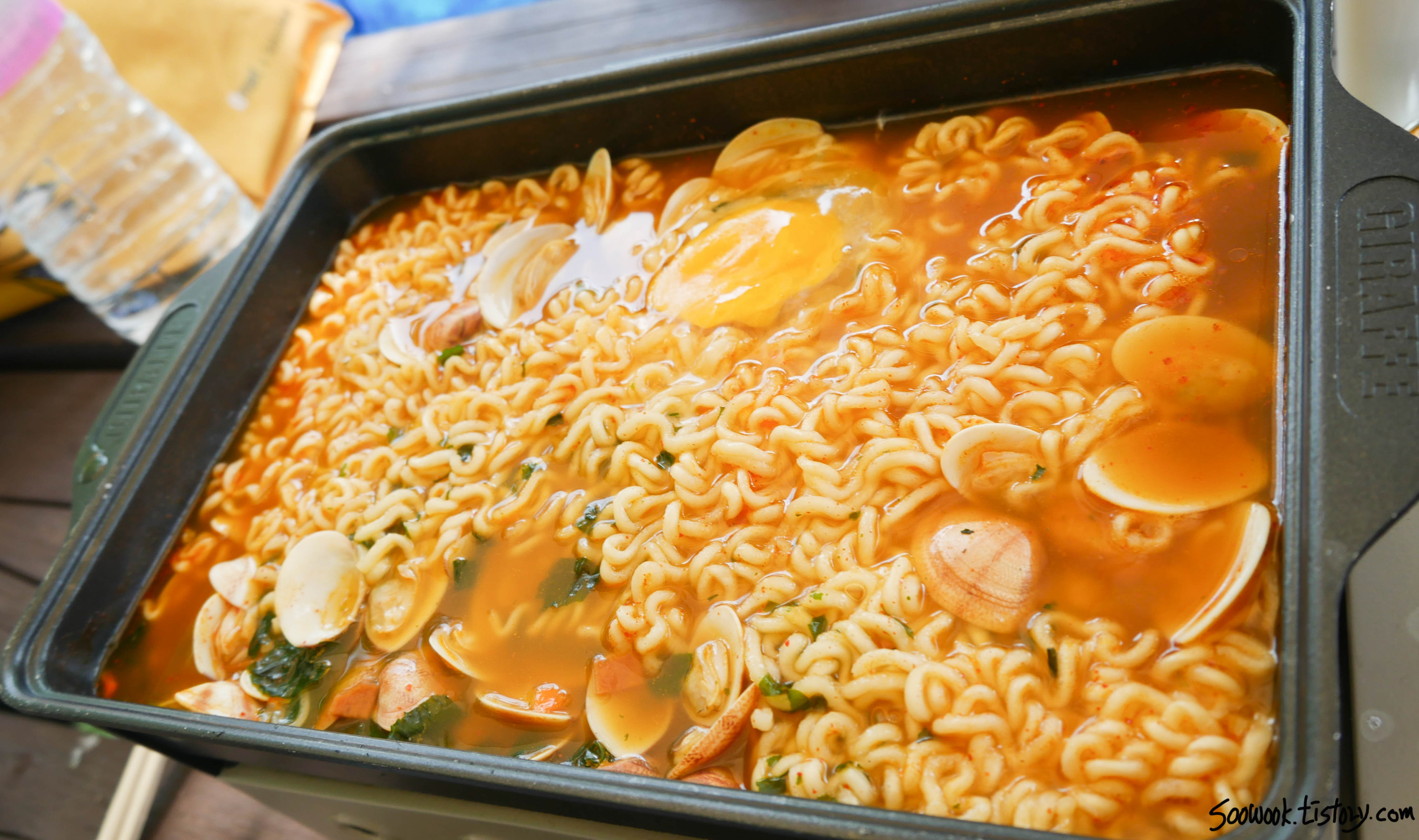 일단 송지호 오토 캠핑장에서 눈을 떠서 어제 채집한 조개와 라면을 조리해서 먹었다.
