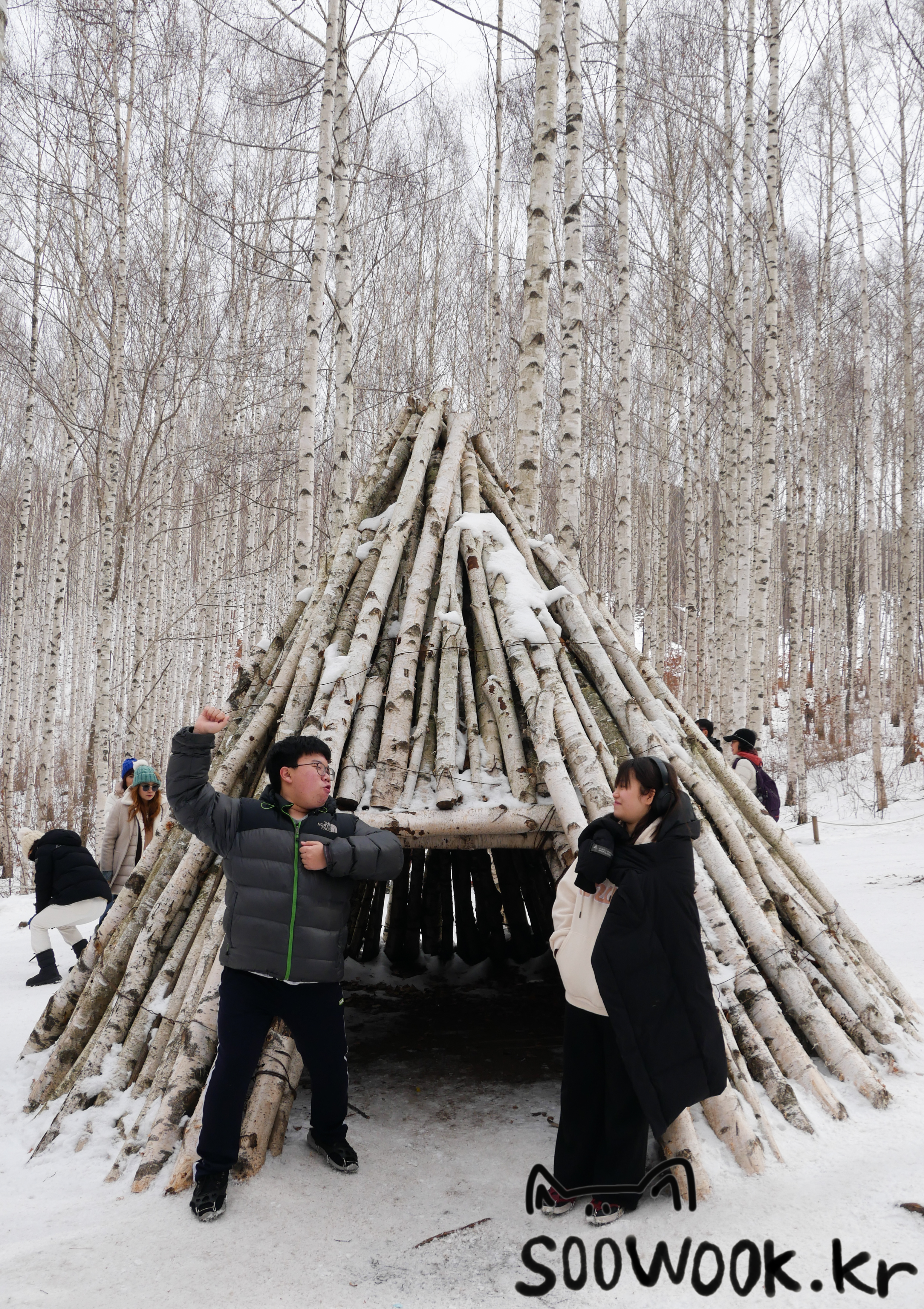 자작나무 숲에서 유명한 오두막에서 줄서서 사진을 찍었다.