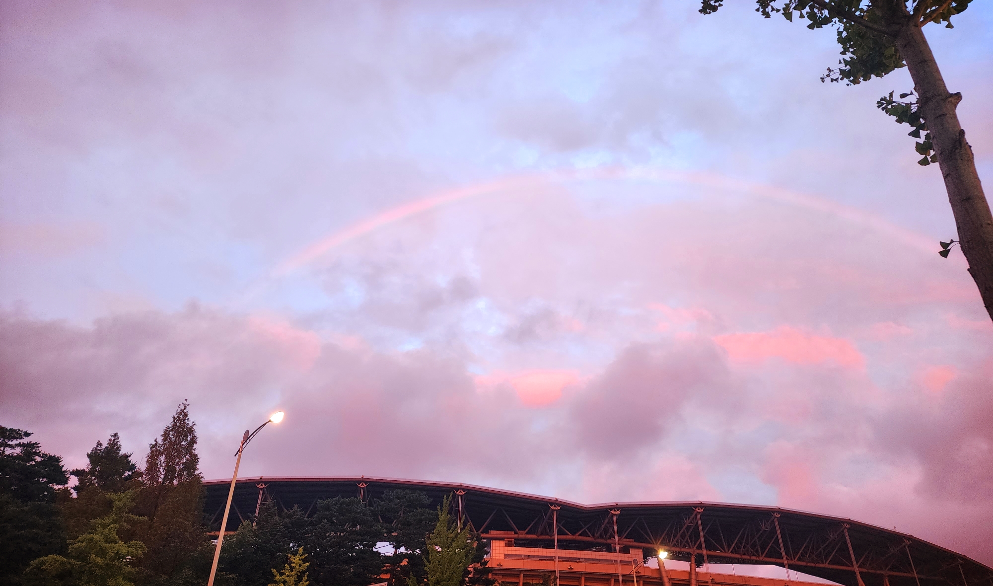 하늘에 구름 사이에 무지개가 있었다.
